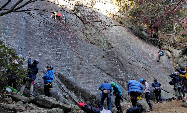 トップロープがすだれ状態だったので、アイゼンアックスで中央壁左ルートと中央ルートの隙間を、リード/フォローで1本登らせてもらいました。