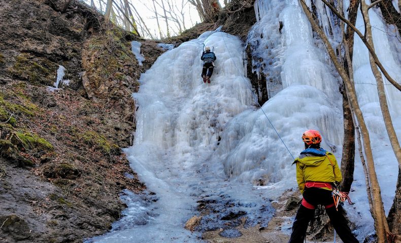 氷にトップロープを張り、佐藤さんの指導で蛭田さんに基本練習を10本してもらいました。
