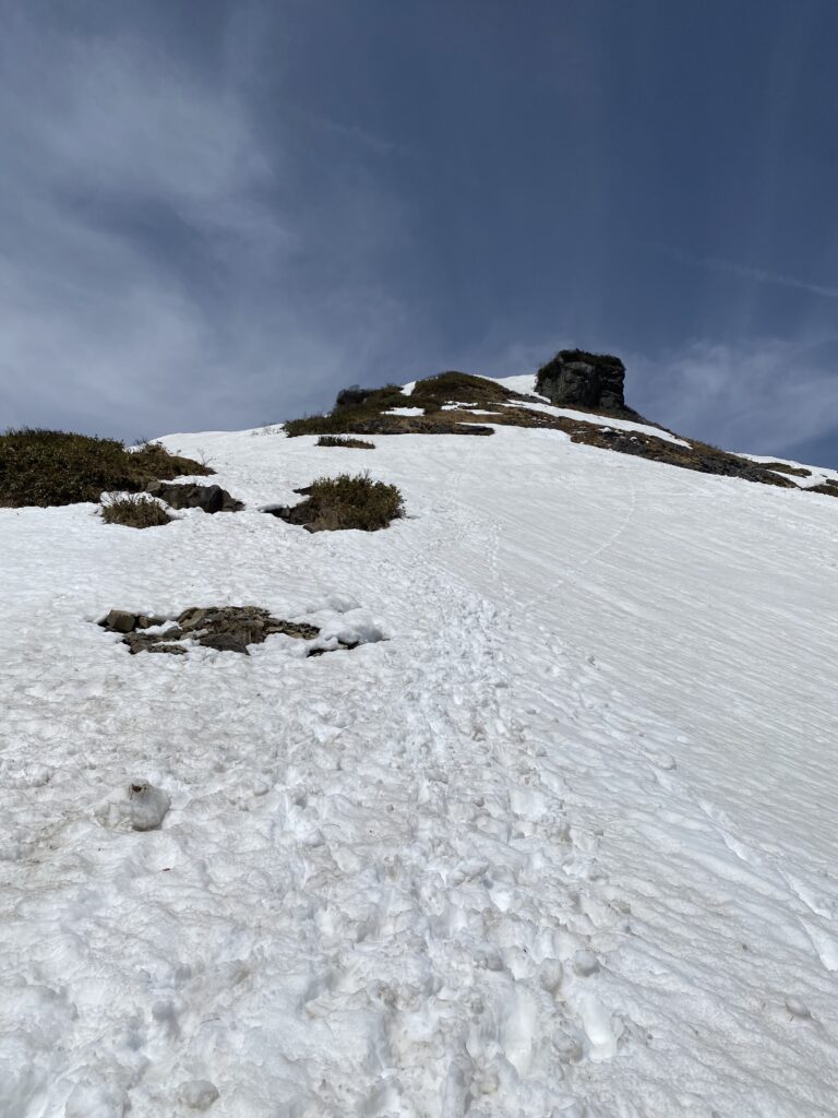 雪は標高1,200mまではほぼ無く、1,400mから上部は雪稜でしたが、クラックや空洞化箇所が多く、雪も腐っていて今週末が最後のような気がします。