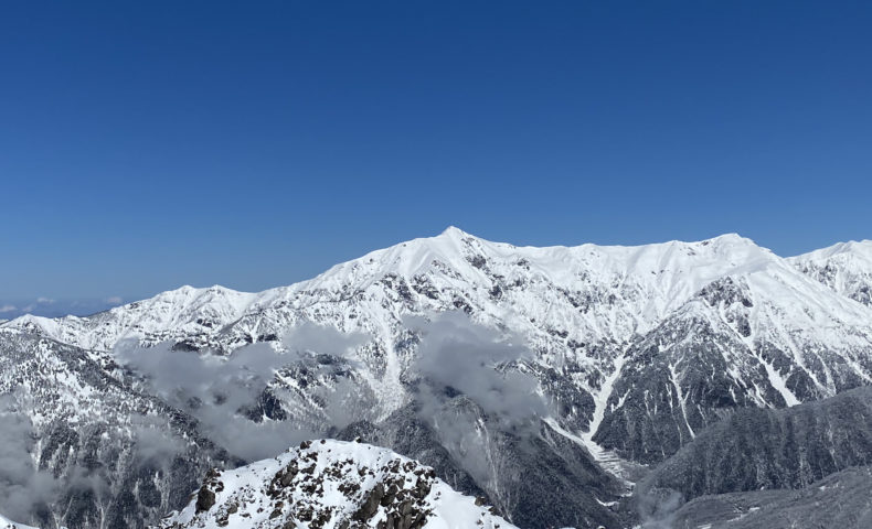 下山し、ただいま帰宅中です。昨晩は月明かりが雪面に反射し昼間のように明るく、今日は槍穂や乗鞍に雲が掛かって