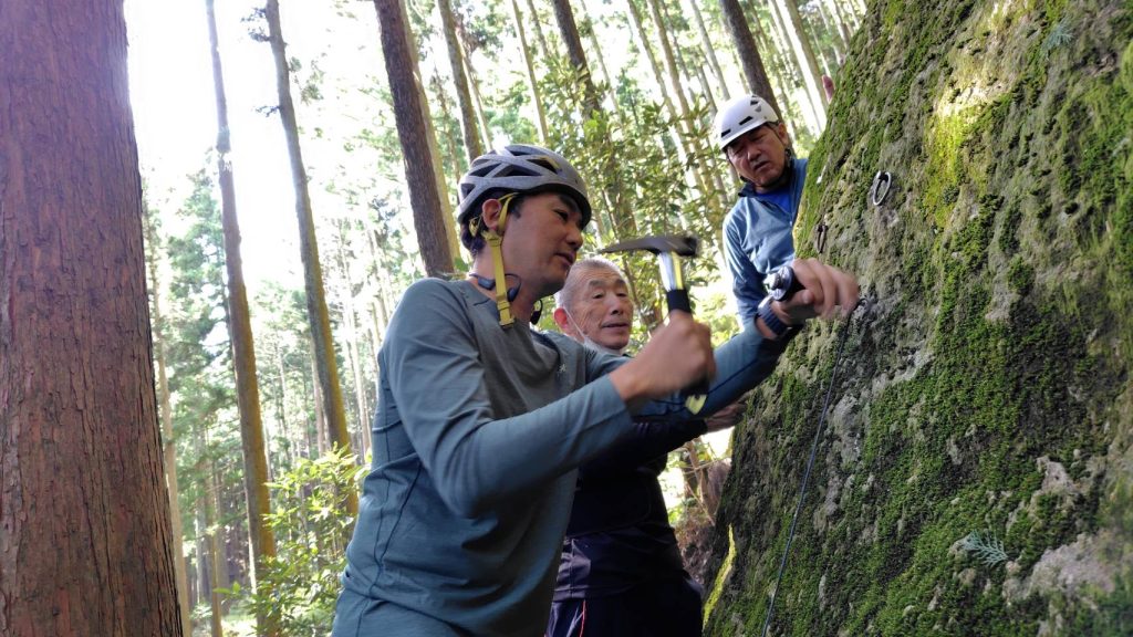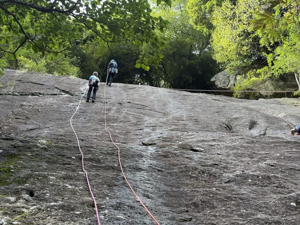 リングボルト・ハーケンの打ち方、ダブルロープでのリード、2人同時の懸垂下降を練習します。